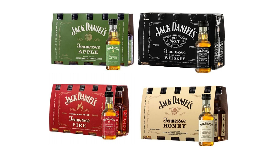 4 packs de Miniaturas Whisky Jack Daniels 50 ml Originales N7, Honey, Fire y Apple